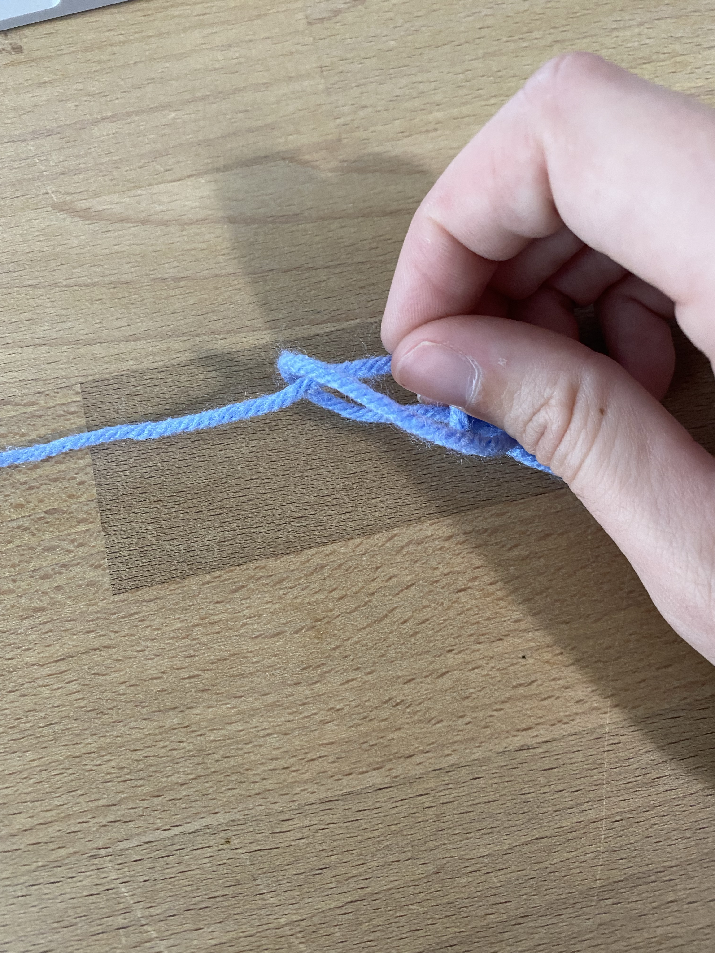The make an official chain, place the working yarn (the yarn that is attached to your skein or ball of yarn) and pull it through the slip knot loop on your hook. Doing this, the loop on your hook should be your new loop and not the slip knot.