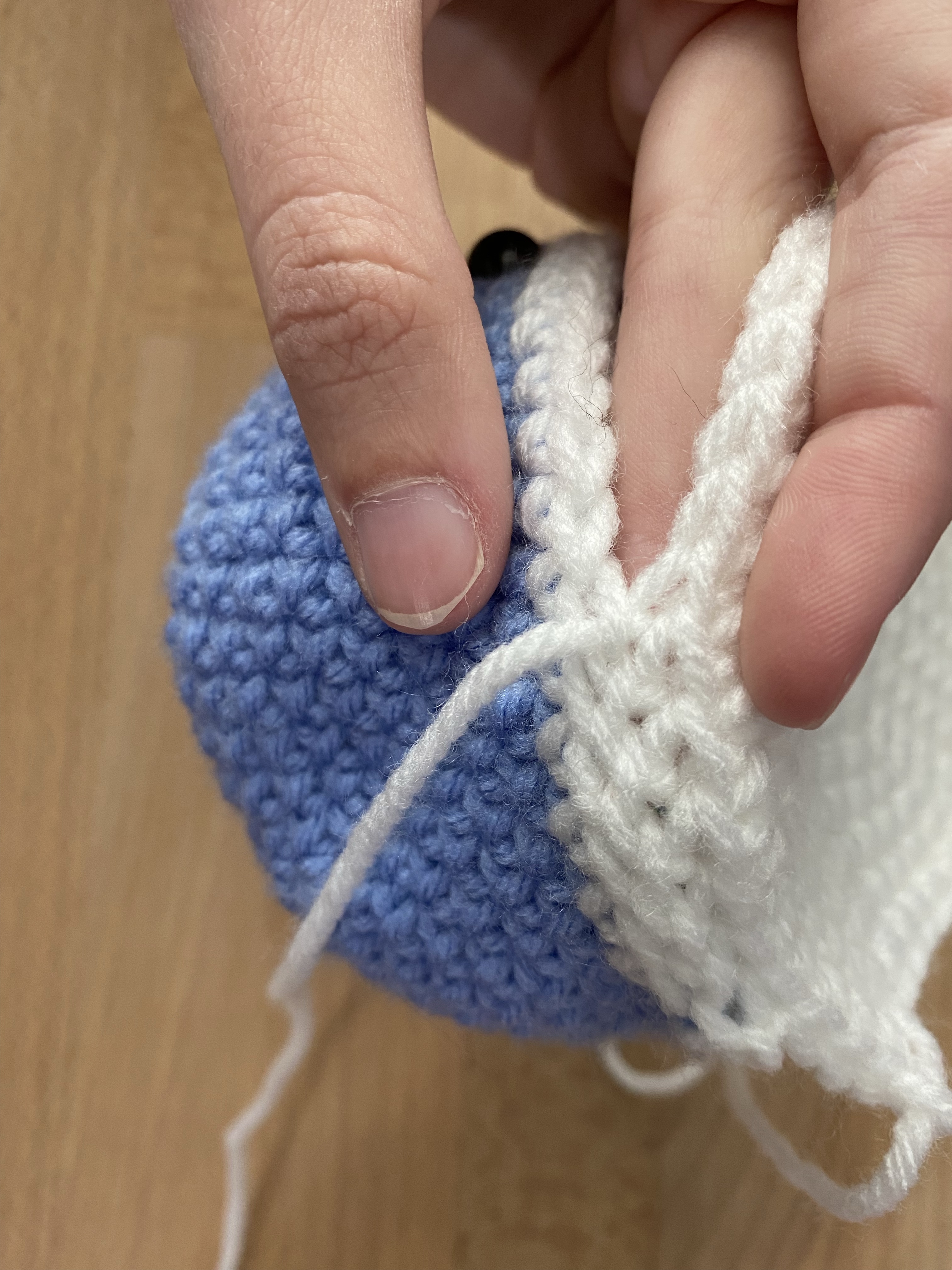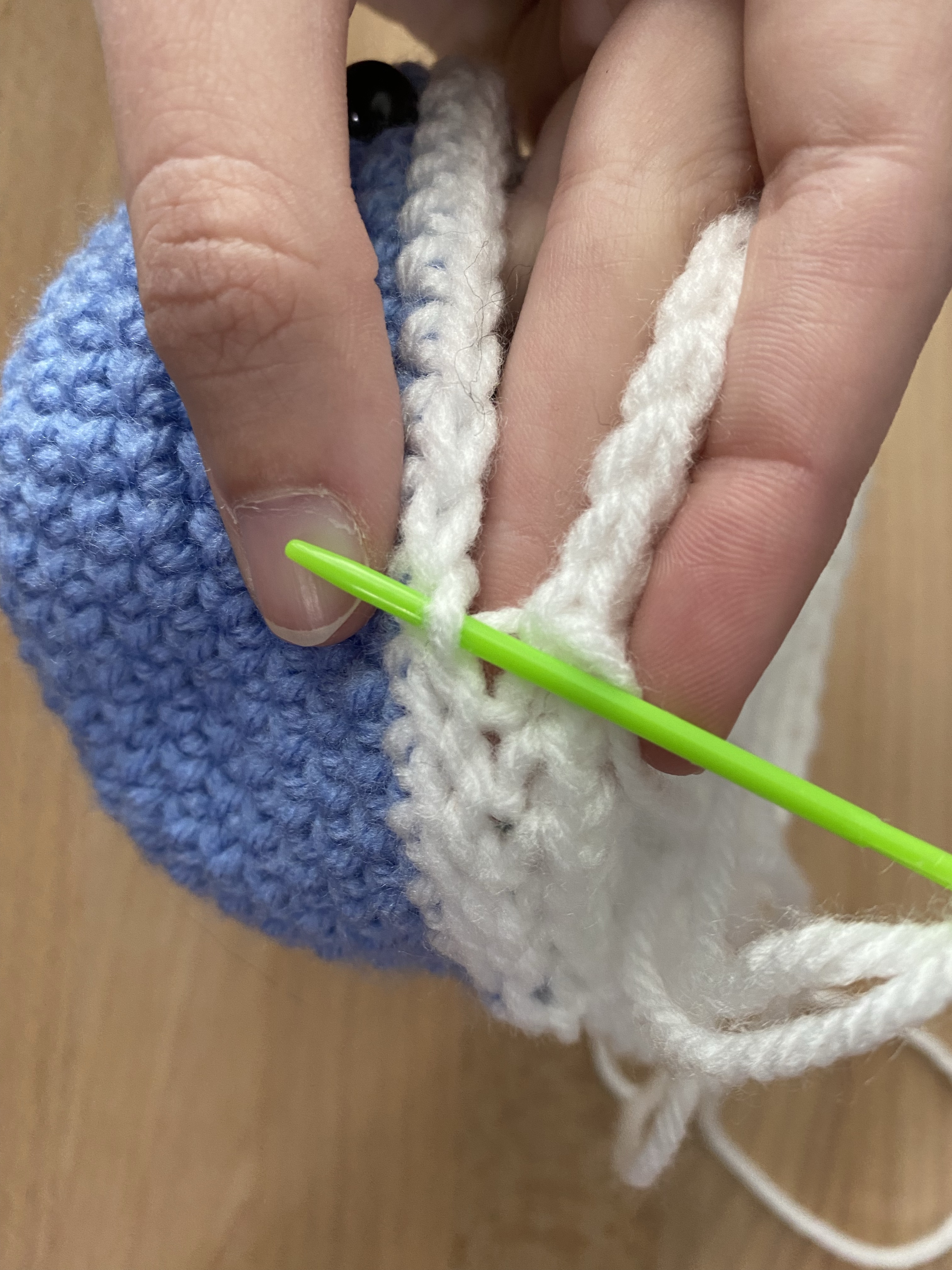 Specifically, for the whale, I am going in the back loop of the bottom piece and the front loop of the top piece. Through a few examples, I figured out that I like the way this looks best but it really doesn’t matter. You can go through the whole stitch if you would like.