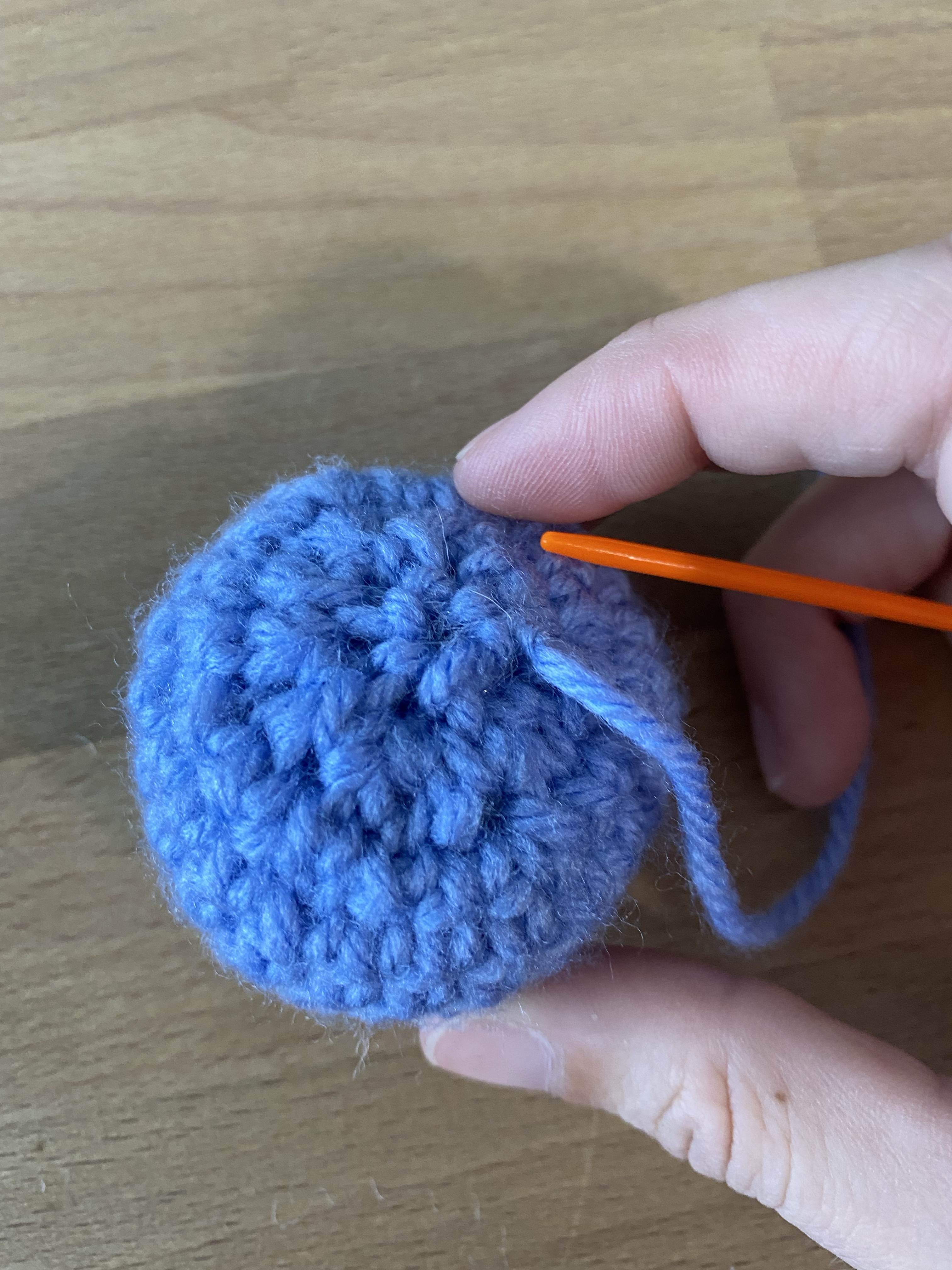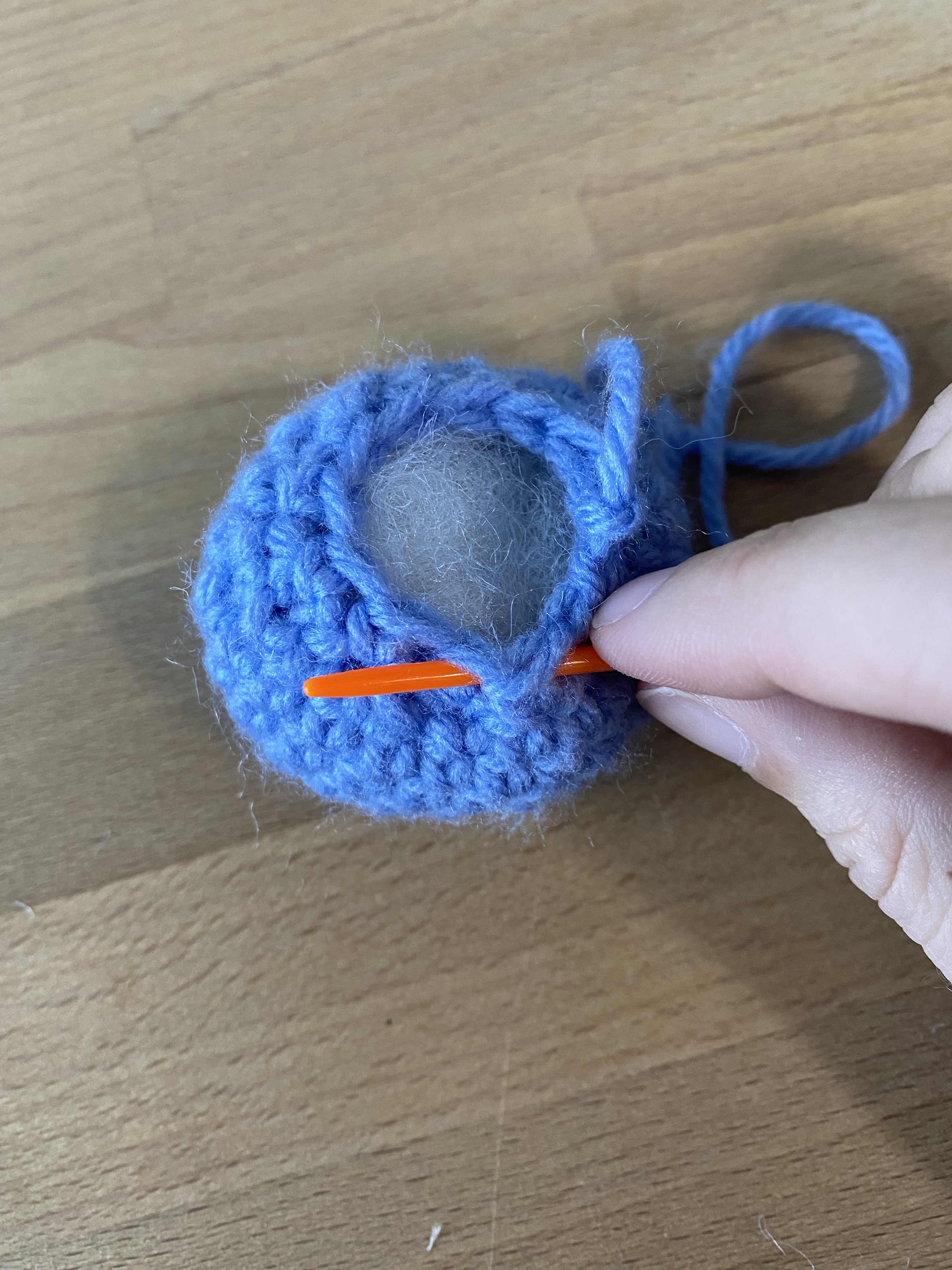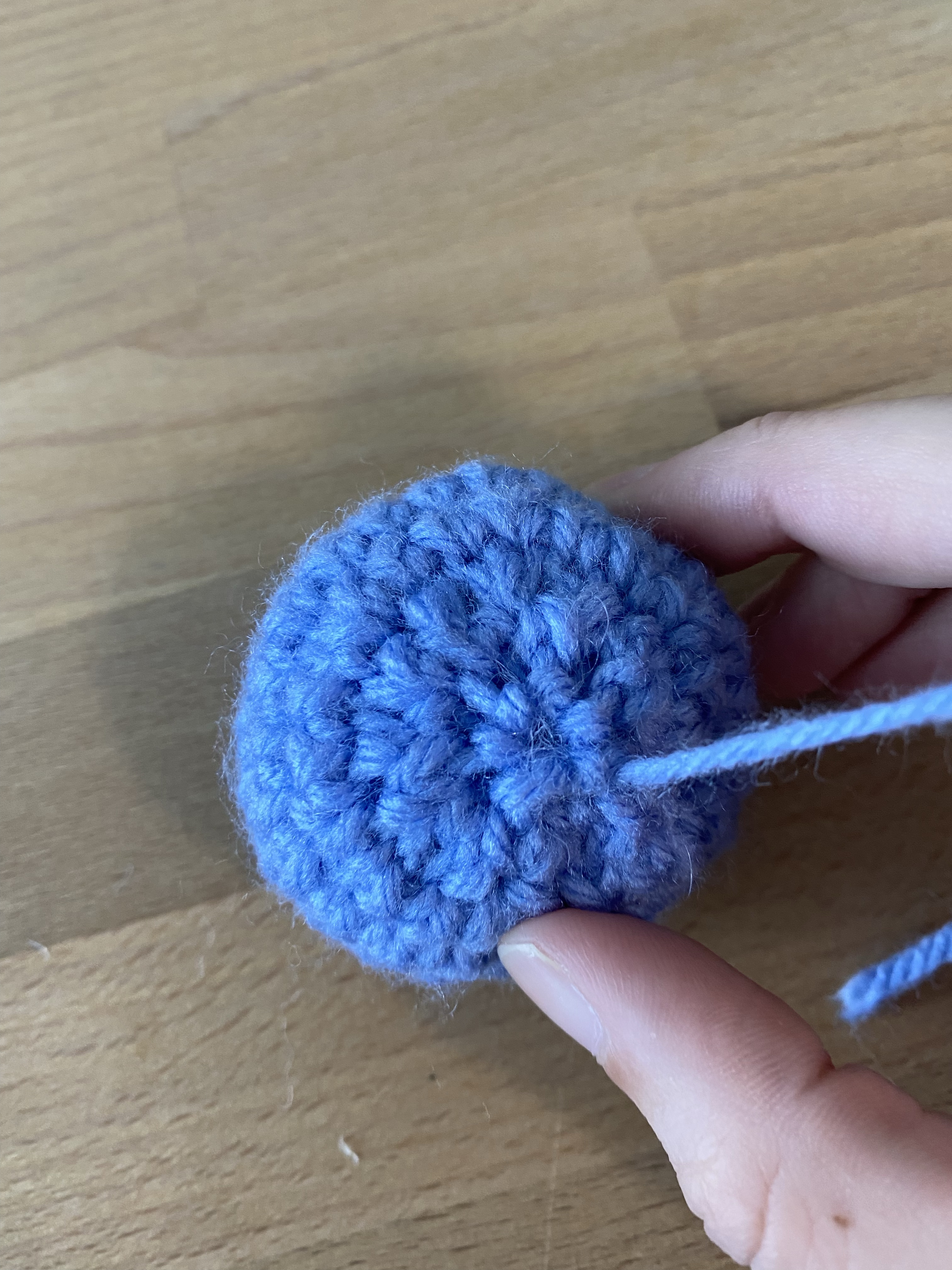 After you’ve stuffed your piece and fastened off, keep your yarn tail on the tapestry needle. In your last stitches (usually 6 or 12 stitches), weave your needle in and out through the stitches. Once you’ve gone through all the stitches, pull your tail tight until your piece closes! Tie a simple knot right at the base of your piece and weave in your ends.