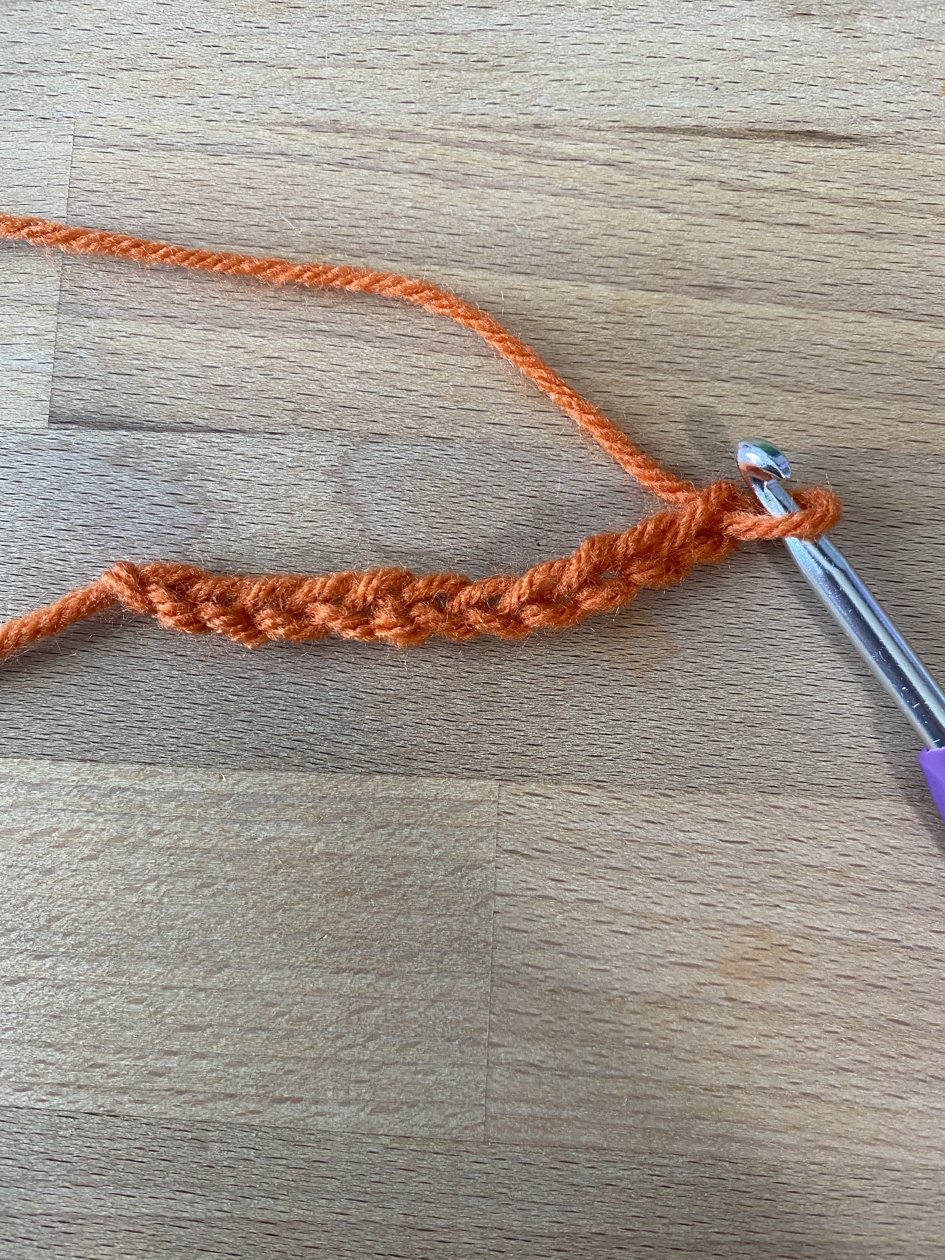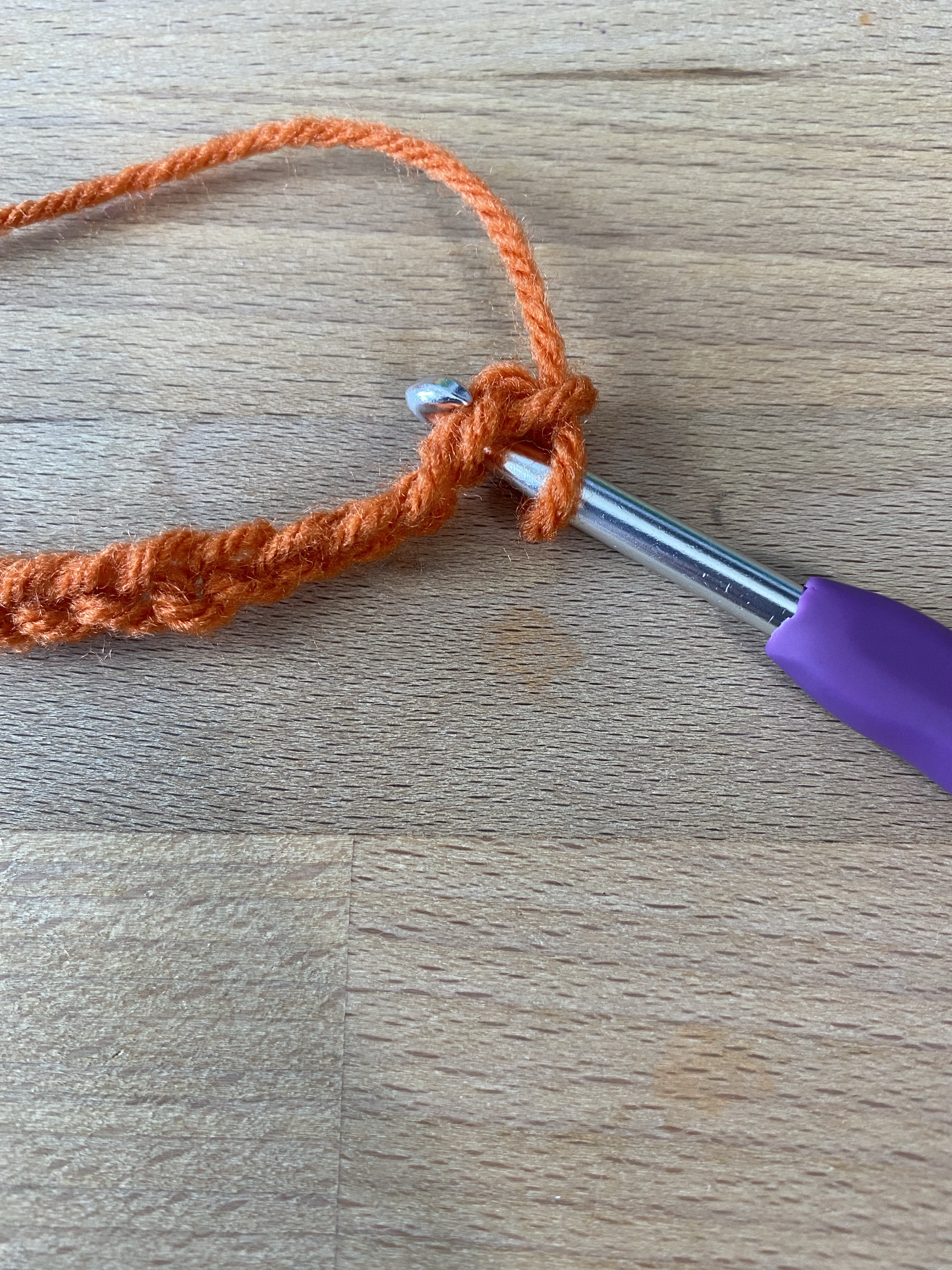 For single crochet, if we want the first row to be 10 stitches, we are going to make 10 chains plus an additional one. When you add your single crochets, you are going to start by placing your hook in the second chain from the hook (and a lot of patterns phrase it like this). When you finish crocheting your row, add 1 chain (the turning chain) and flip your piece around so you work in the other direction.