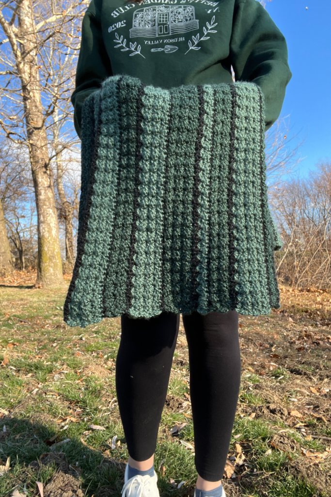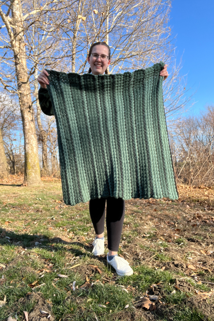 This blanket uses Lion Brand Heartland yarn which is SO SOFT. I loved working with this yarn because it’s just so soft to work with. I chose two greens and a black to create the look of long pines and to remind me of summer while I’m in the middle of my first Fort Wayne, Indiana winter.
